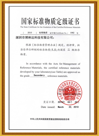 國家標(biāo)準(zhǔn)物質(zhì)定級證書(2010年)